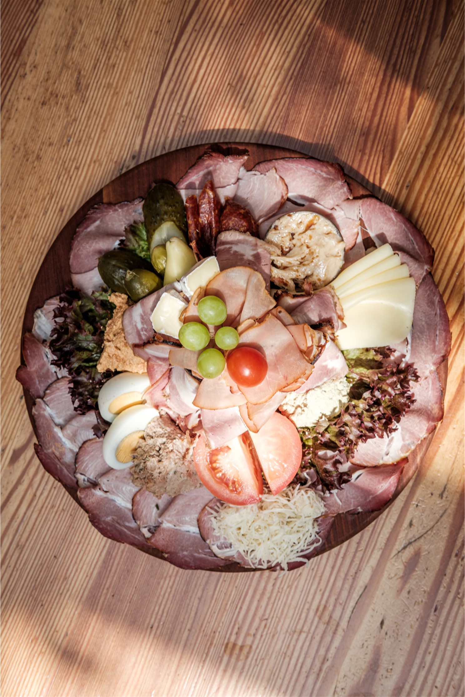 • eine klassische Hausplatte belegt mit Schinken, Käse, Selchwürstl, Brüstl, luftgetrocknetem Karree, Speck, Essiggurken, Tomaten, Paprika, Eiern, steirischem Kren, Kürbiskernaufstrich, Liptauer, Verhackertem und Leberstreichwurst