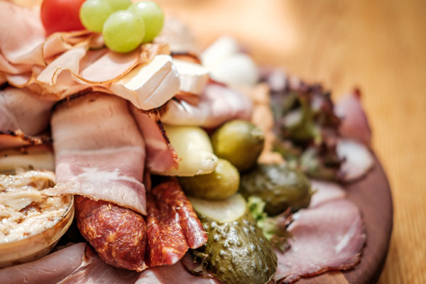 • Platten mit Schinken, Käse, Selchwürstl, Brüsterl, Karree, Speck, Essiggurken, Tomaten, Paprika, Eiern, steirischem Kren,